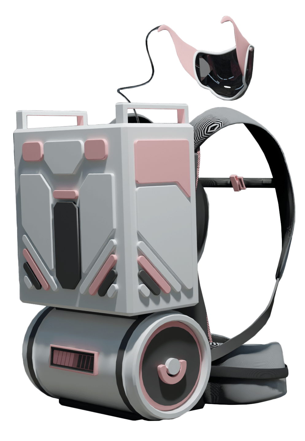 An oxygen tank built into the backpack, providing a reliable supply of breathable air in low-quality air situations. Compact yet powerful, the tank supports the mask and is designed to be easily refilled using liquid oxygen refilling stations.